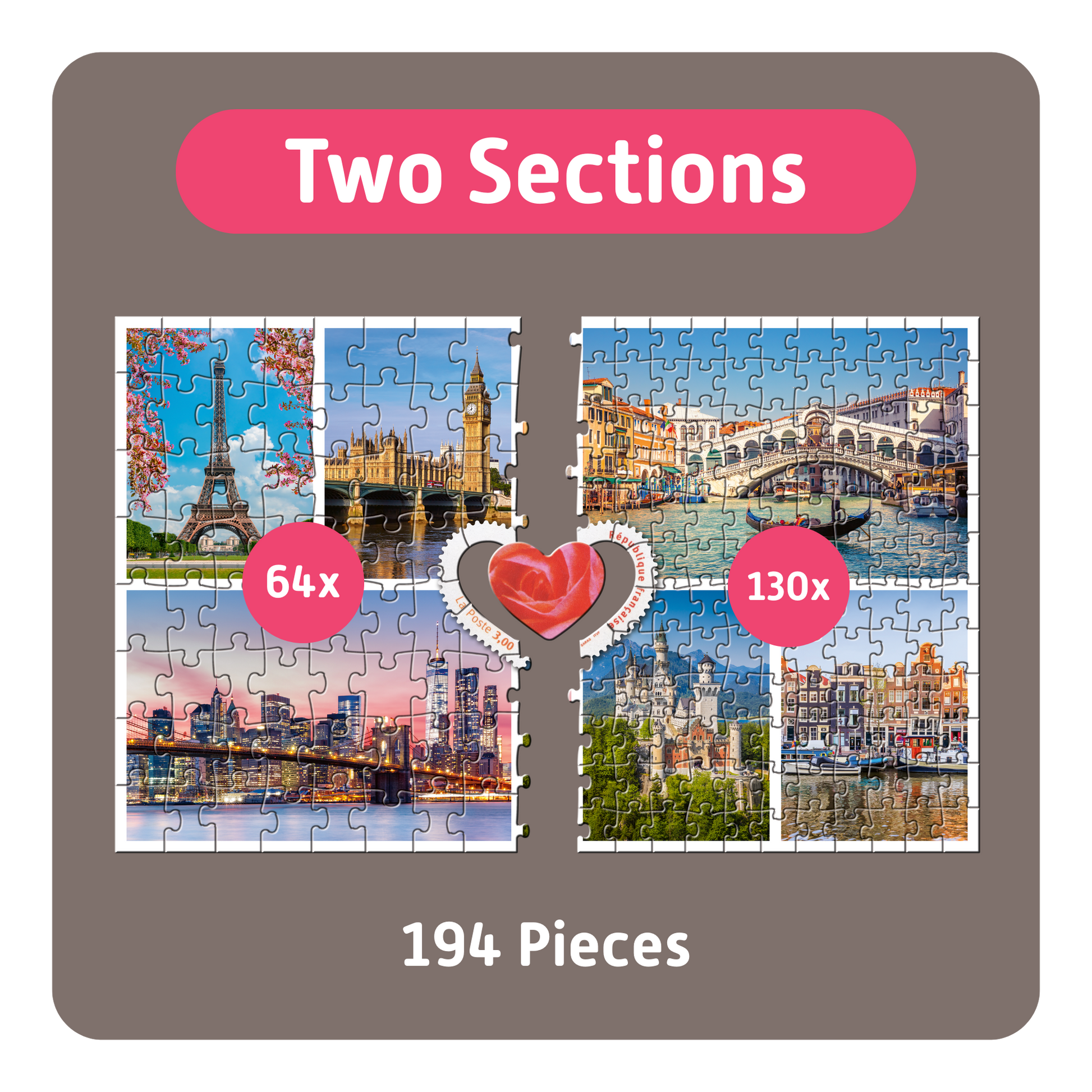 Each of our puzzles is different: some with large and some with small pieces, some in two halves or four quarters, and some with 194 to 1000 pieces. What unites them all is the shared joy of puzzling and a central piece that comes together at the end. This central piece is in every TEAMPUZZLE – it's the puzzle piece that ultimately brings everything together and represents what makes TEAMPUZZLE so special: shared time with family and friends.