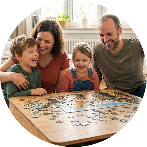 The idea for TEAMPUZZLE originated in a Hamburg publishing house and stems from a very simple desire: to create more shared time with family and friends. Completely screen-free, live and in color, filled with conversation, memories, and the joy of puzzling.