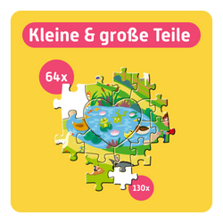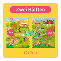Für gemeinsamen Puzzlespaß: Dieses Puzzle ist in zwei Hälften geteilt – 64 große Teile für Kinder ab 4+ und 130 kleine für Erwachsene ergeben ein Motiv. Beide puzzeln bis zur Mitte und setzen zusammen das Herzstück ein.