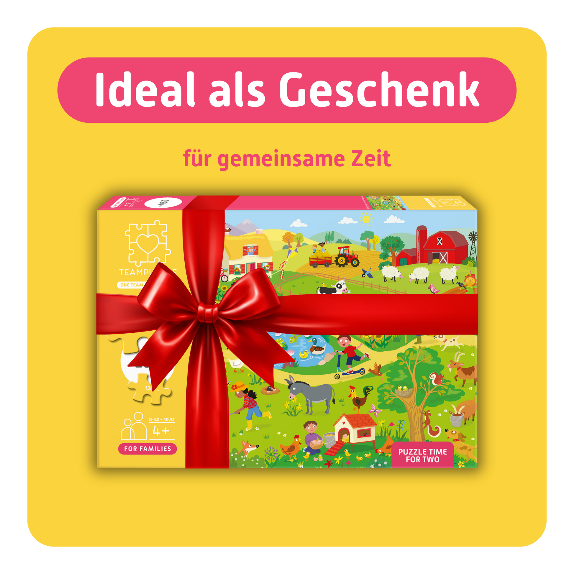 Unsere TEAMPUZZLE stellen gemeinsame Zeit in den Mittelpunkt und bringen Generationen zusammen – mit Motiven in zwei Hälften oder vier Vierteln, unterschiedlich großen Puzzleteilen und hochwertig durchdachten Details. So entsteht aus vielen kleinen Momenten ein großes Miteinander. Puzzleteil für Puzzleteil.