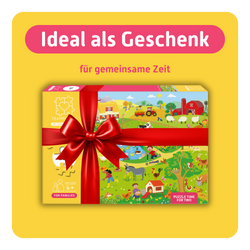 Es muht, es kräht, es brummt – auf dem Bauernhof ist ganz schön was los! Ein Puzzleerlebnis für Kinder ab 4 Jahren zusammen mit ihren Eltern, älteren Geschwistern oder anderen Familienmitgliedern. Entdeckt zu zweit ein Wimmelbild voller Bauernhof-Geschichten – mit Kühen auf der Weide, dem Traktor auf dem Feld und dem bunten Treiben rund um Stall und Hof. Ja, was sucht denn der Fuchs da am Hühnerstall?