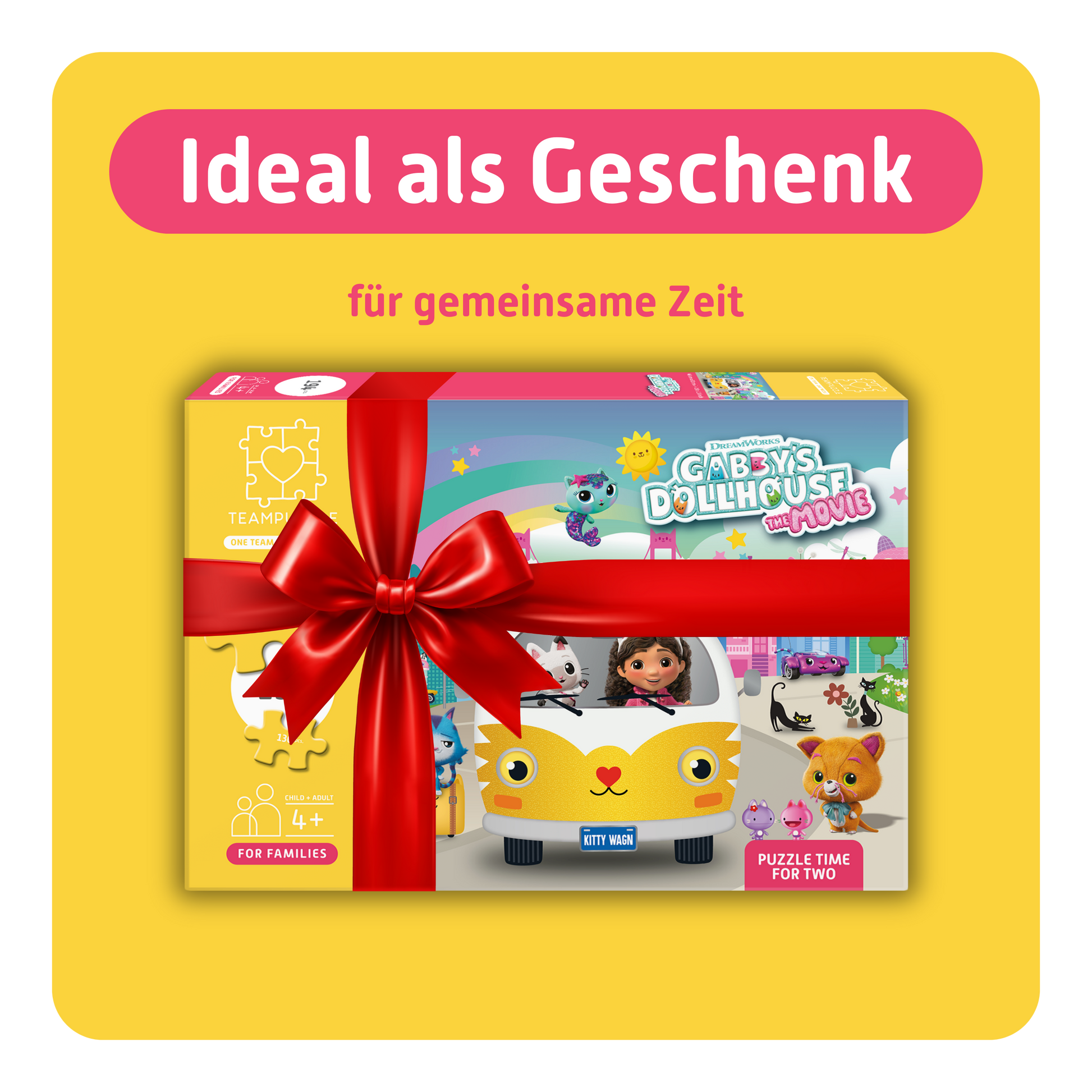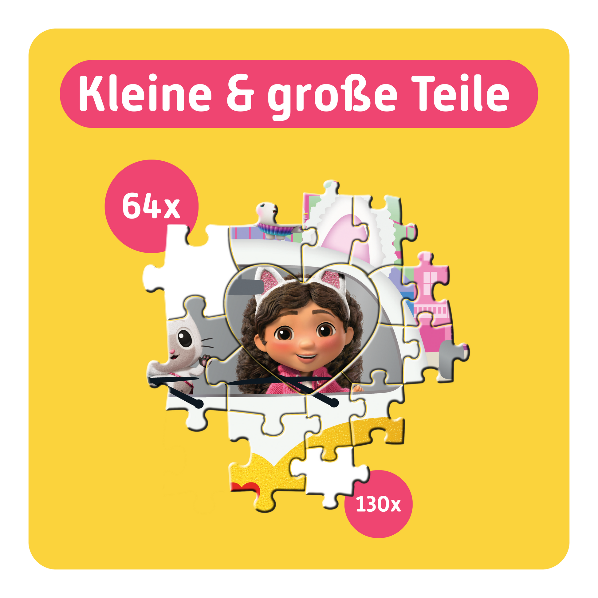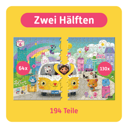 Ein katztastisches Puzzleabenteuer zu zweit für kleine und große Fans von Gabby’s Dollhouse – ideal für Kinder ab 4 Jahren zusammen mit ihren Eltern, älteren Geschwistern oder andere Familienmitgliedern. Entdeckt in einem kunterbunten Motiv aus dem Kinofilm Gabby und ihre Katzenfreunde CatRat, MerCat, Cakey Cat, Kitty Fairy, Carlita, Chumsley und natürlich Gabby's besten Freund Pandy Paws.