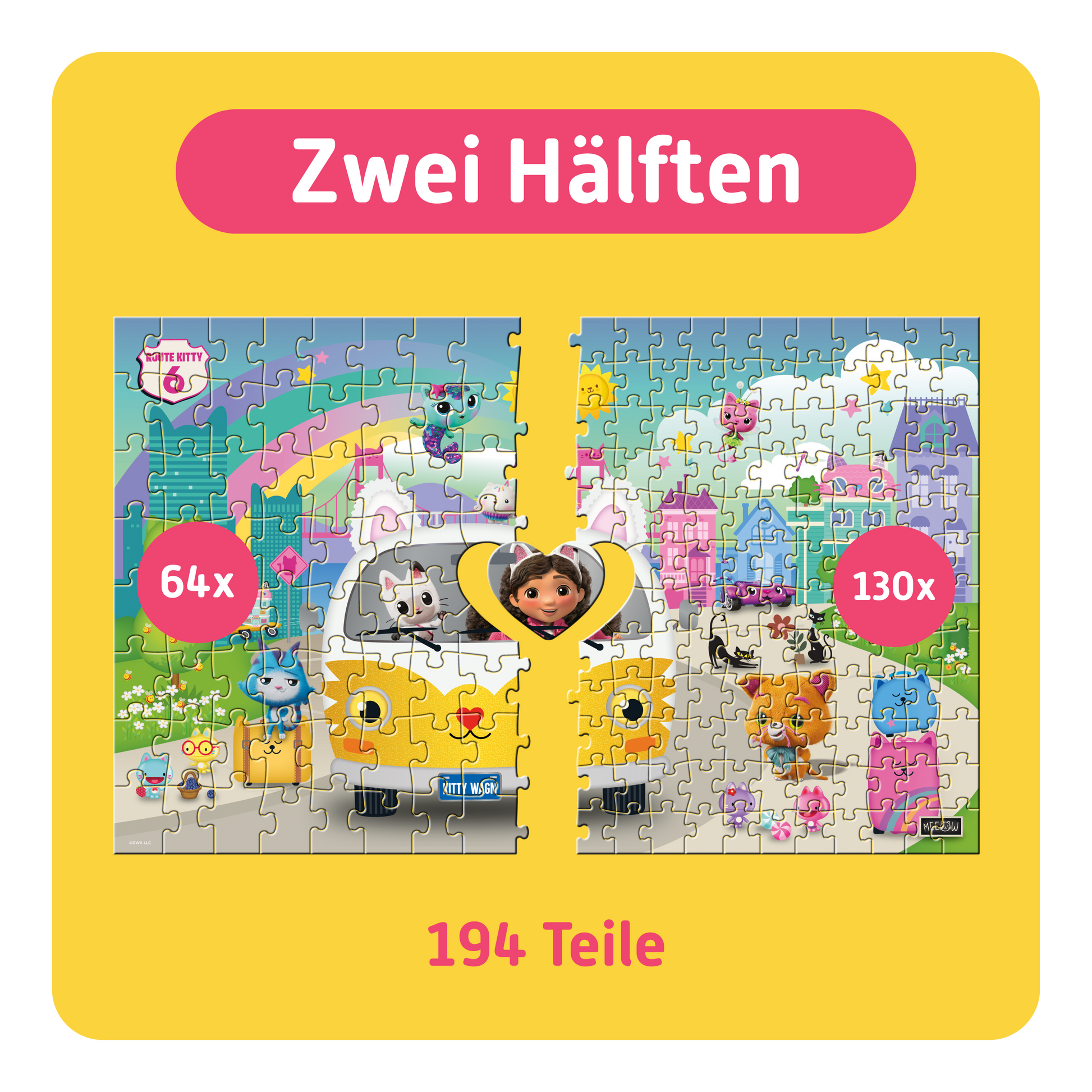 Für gemeinsamen Puzzlespaß: Dieses Puzzle ist in zwei Hälften geteilt – 64 große Teile für Kinder ab 4+ und 130 kleine für Erwachsene ergeben ein Motiv. Beide puzzeln bis zur Mitte und setzen zusammen das Herzstück ein.