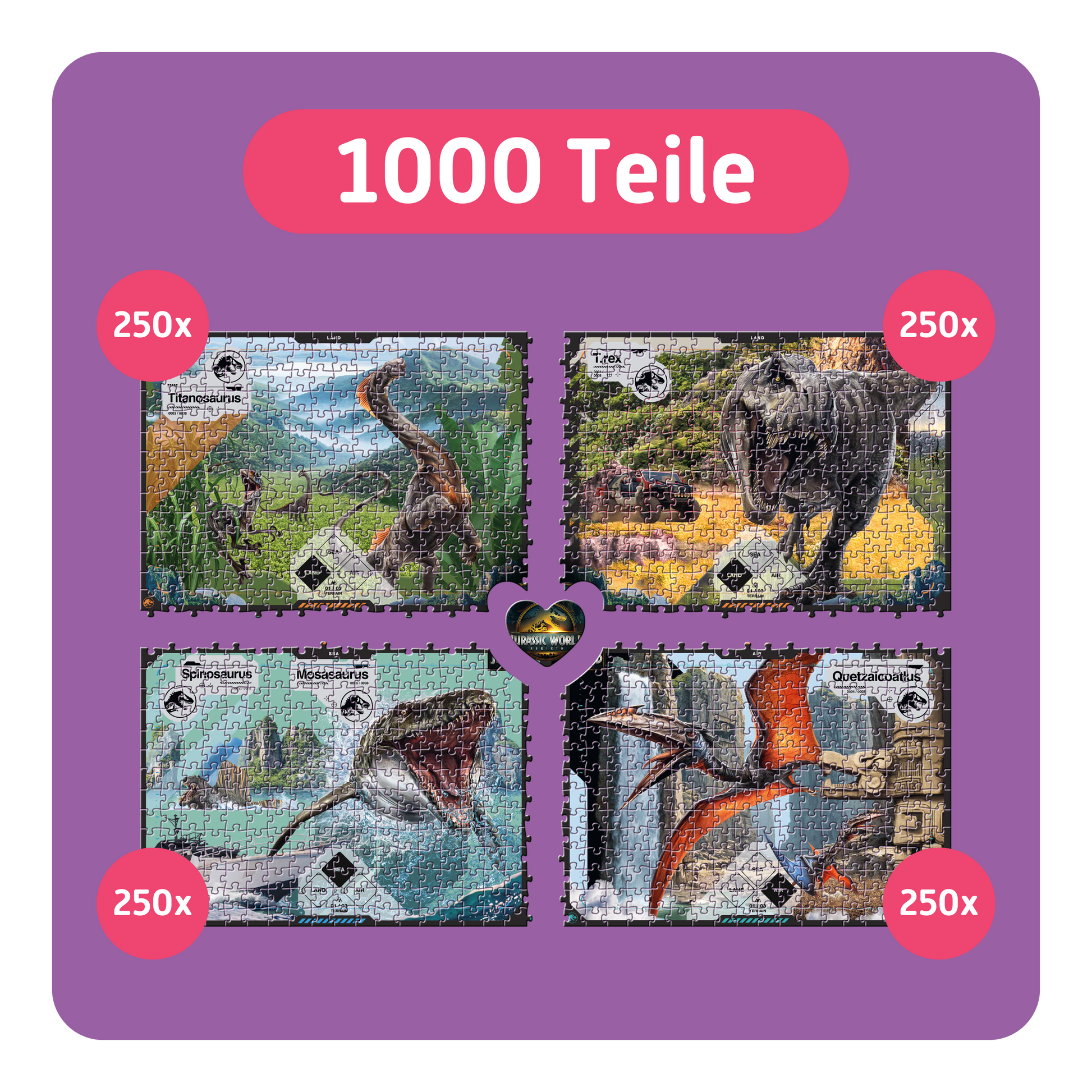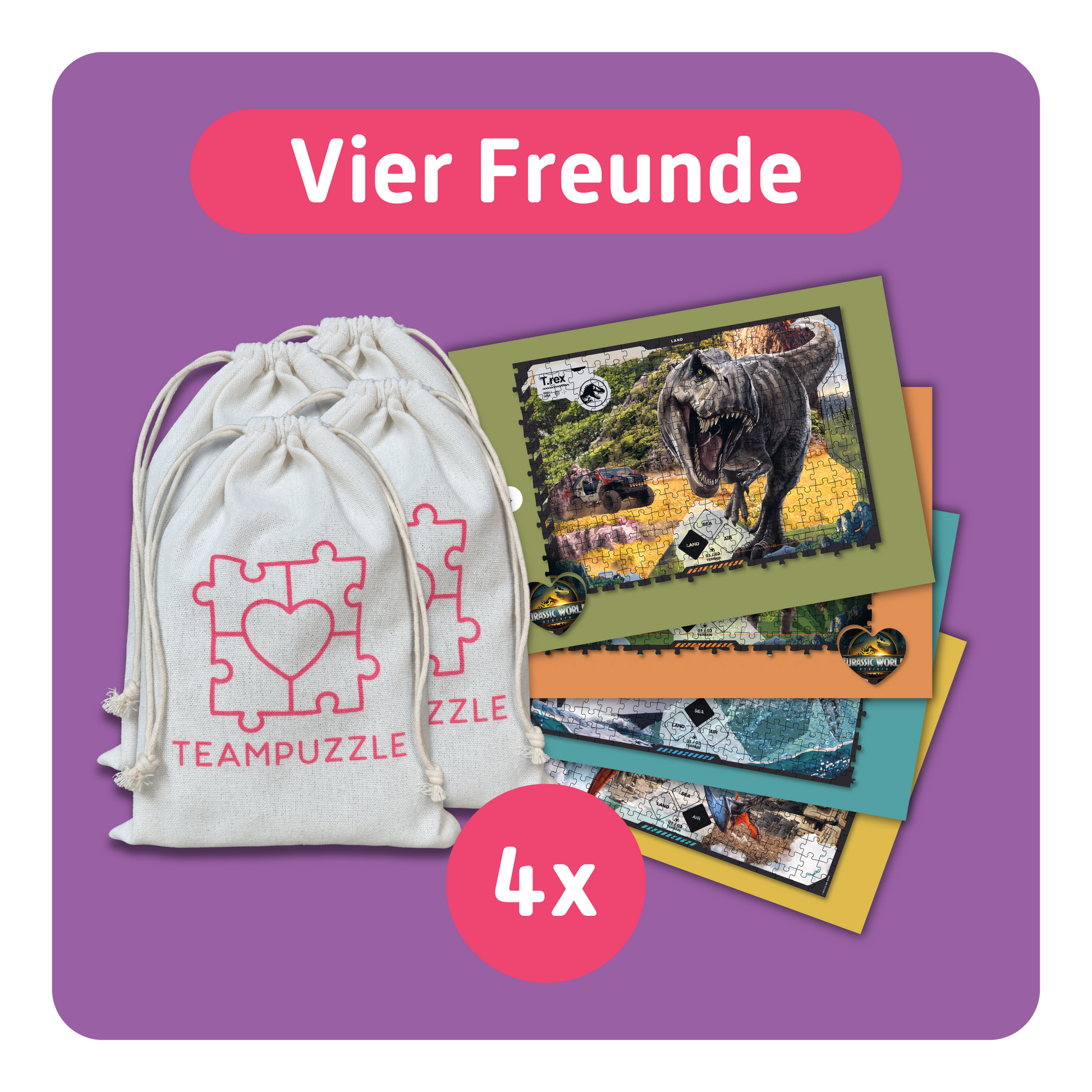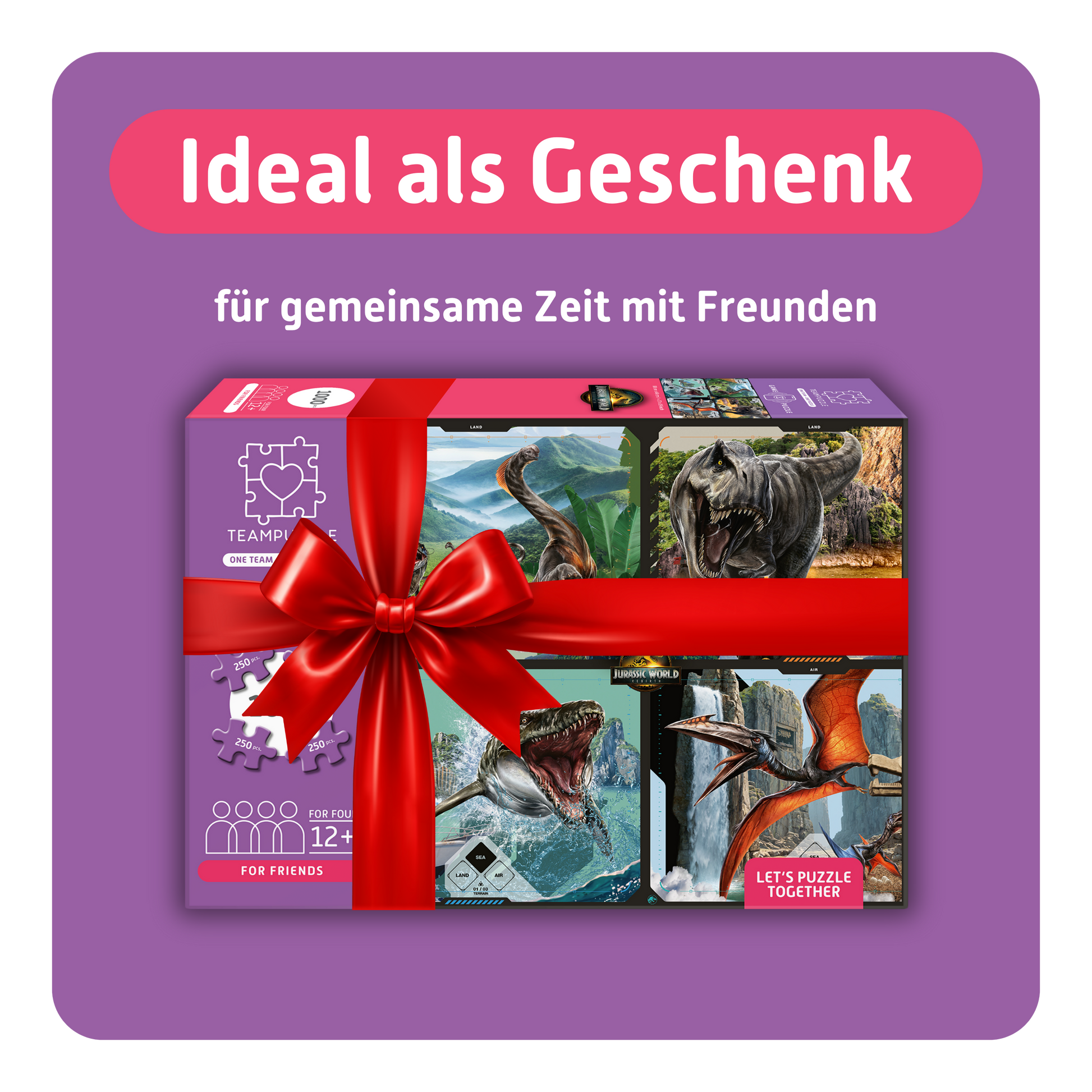 4 Spieler, 4 Welten, 1 Puzzle – und wer mag, eine extra Portion Action. In diesem TEAMPUZZLE For Friends taucht ihr in die Welt von Jurassic World ein und erlebt Dinosaurier zu Land, im Wasser und in der Luft. Vier Motive zeigen eindrucksvolle Szenen aus der Welt der Urzeitgiganten und bringen das Abenteuer direkt auf den Tisch. Für zusätzlichen Spielspaß sorgt die kostenlose Game App – sie stellt eure bisherigen Puzzle-Erlebnisse ordentlich auf den Kopf. Der nächste Spieleabend mit Freunden kann kommen!
