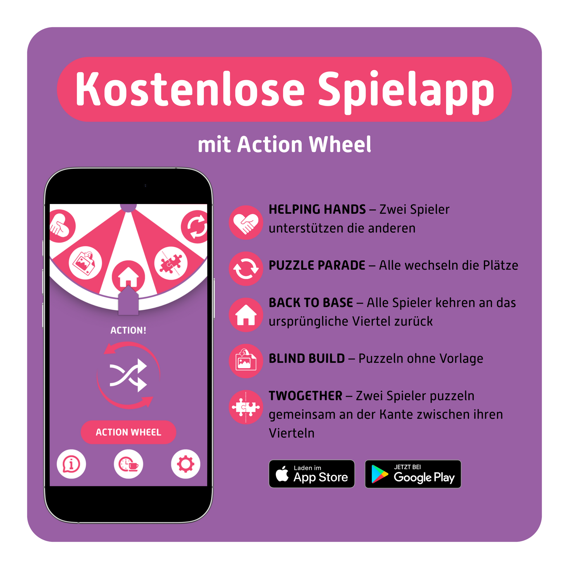 Mehr als Puzzeln: Mit der kostenlosen Game App kommt Schwung ins Spiel. Das Action Wheel sorgt für kleine Challenges und unerwartete Wendungen – mal werden Plätze getauscht, mal verschwinden die Vorlagen oder zwei Spieler puzzeln plötzlich zusammen. Jede Drehung ändert das Spielgeschehen und das Puzzle wird zum Spiel.