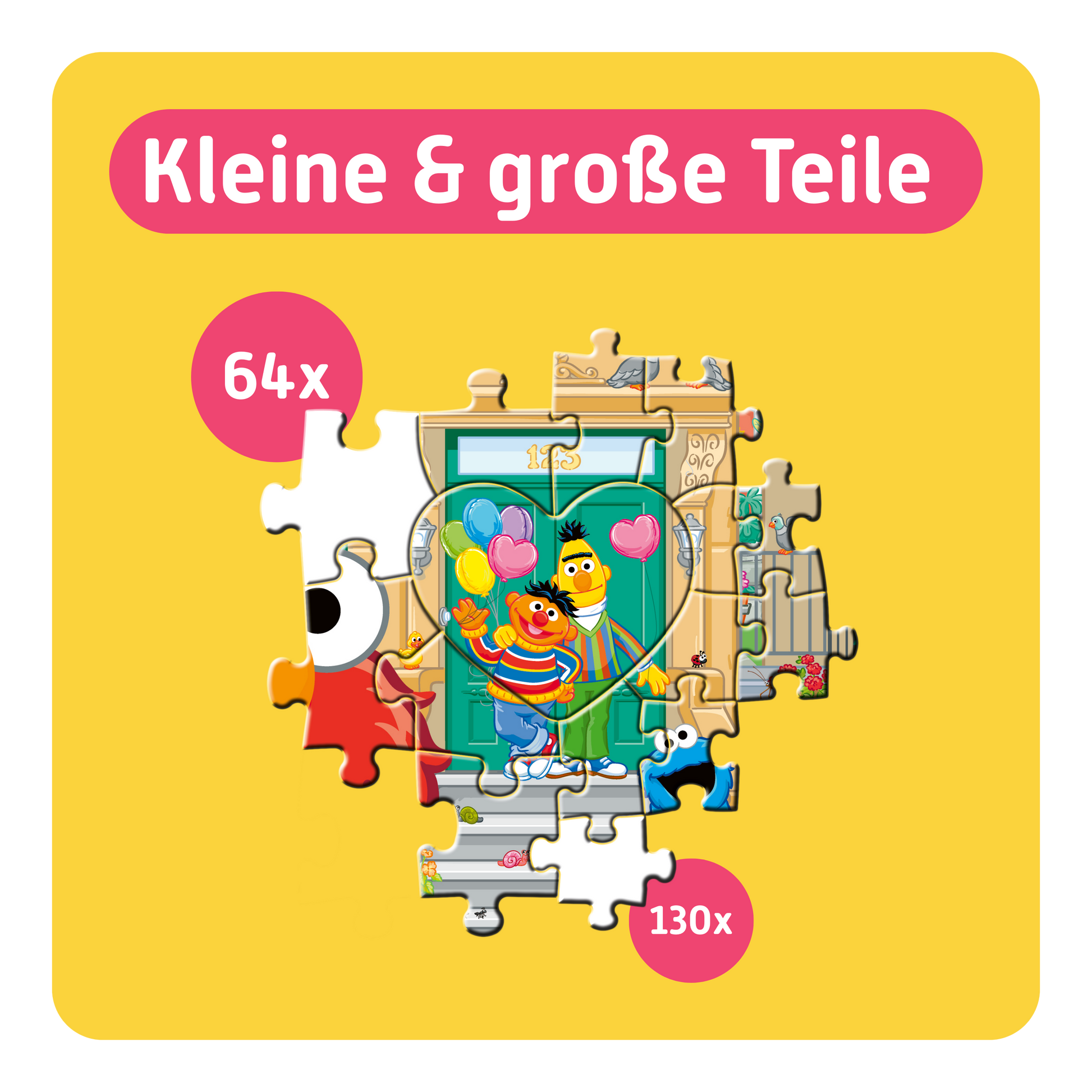 Für gemeinsamen Puzzlespaß: Dieses Puzzle ist in zwei Hälften geteilt – 64 große Teile für Kinder ab 4+ und 130 kleine für Erwachsene ergeben ein Motiv. Beide puzzeln bis zur Mitte und setzen zusammen das Herzstück ein.
