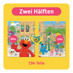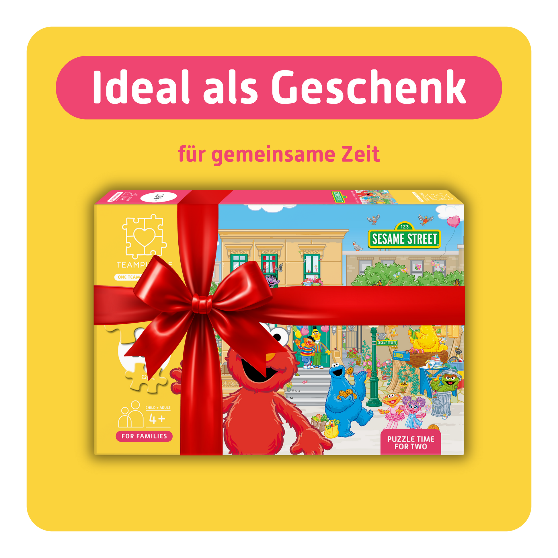 Wieso, weshalb, warum macht TEAMPUZZLE eigentlich so viel Spaß? Ganz einfach: Weil Kinder ab 4 Jahren zusammen mit ihren Eltern, älteren Geschwistern oder anderen Familienmitgliedern zu zweit puzzeln können. Trefft in einem kunterbunten Motiv auf die Bewohner der Sesamstraße – von Elmo über das Krümelmonster bis hin zu Ernie & Bert. Und fliegt da etwa Super-Grobi durchs Bild?